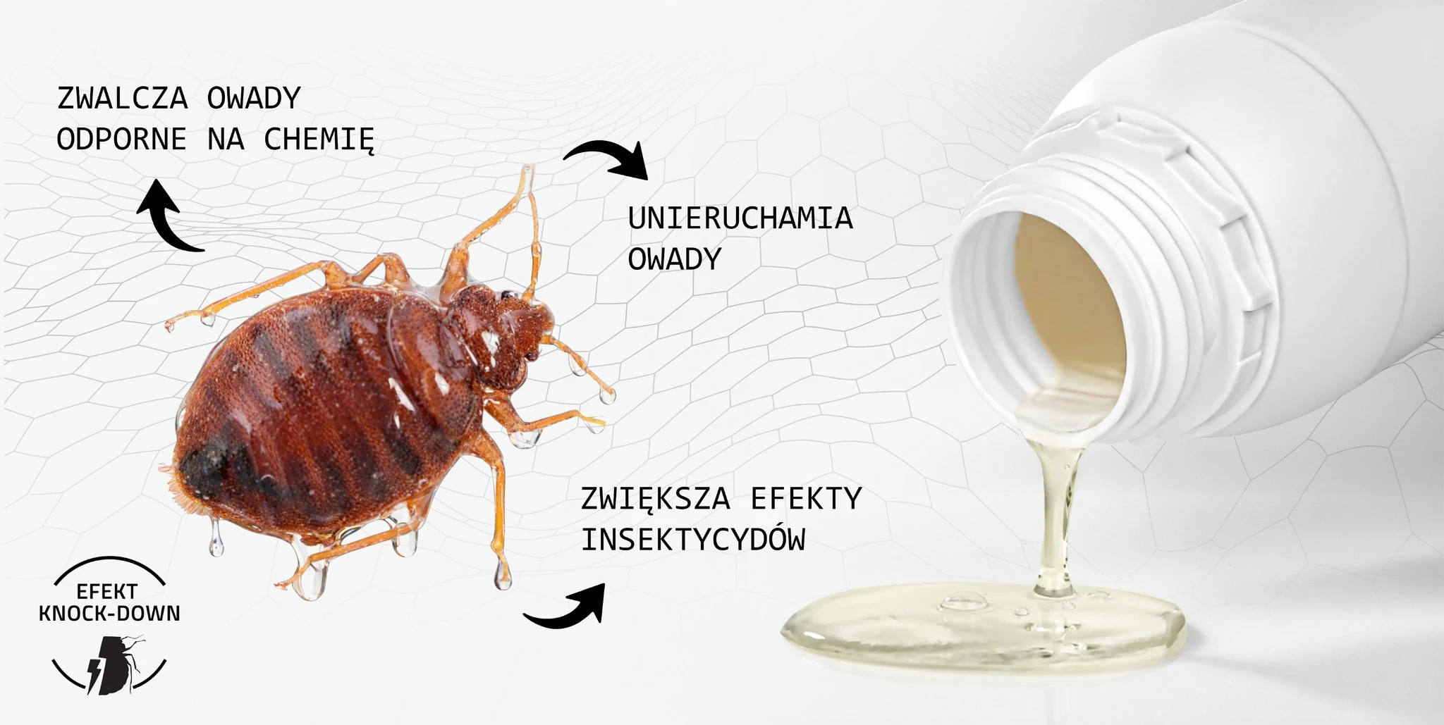 STRONG INSECT BLOCKER POLYMER to preparat na pluskwy, który nie zabija chemią, lecz działa mechanicznie. Po rozpyleniu tworzy polimerową warstwę oblepiającą owada, unieruchamia go i utrudnia oddychanie, dzięki czemu sprawdza się także wobec populacji słabiej reagujących na insektycydy.