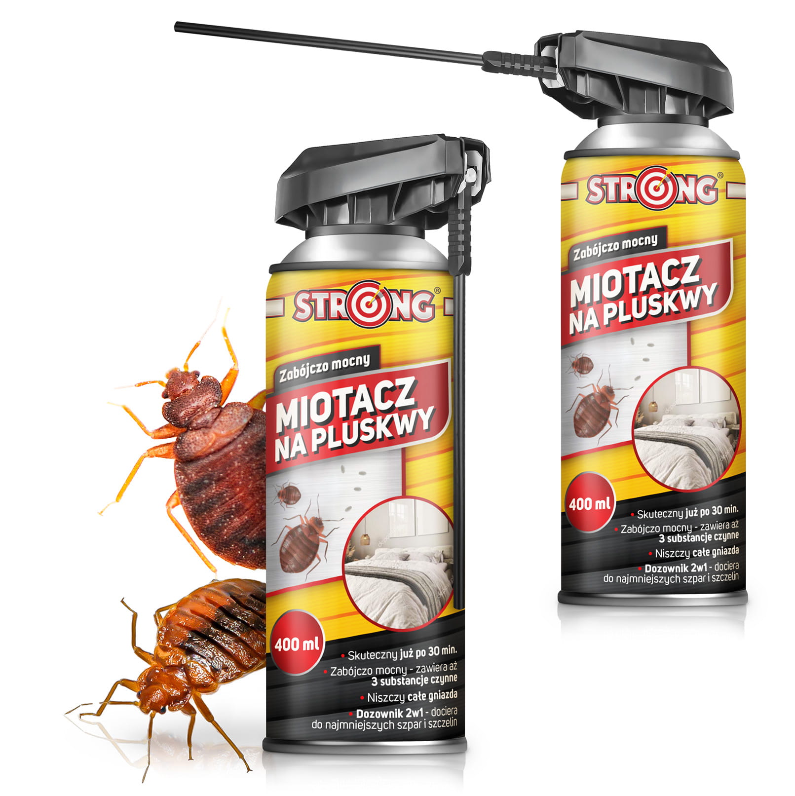 Miotacz wyposażony jest w dozownik 2 w 1, który pozwala wykonywać zarówno szeroki oprysk powierzchni, jak i wyjątkowo precyzyjną aplikację pod ciśnieniem w szwy materaca oraz trudno dostępne zakamarki, do których zwykłe spraye nie docierają. STRONG należy do najskuteczniejszych aerozoli do samodzielnego zwalczania pluskiew w łóżkach i ukrytych przestrzeniach, gdzie konieczna jest mocna i celna aplikacja preparatu.