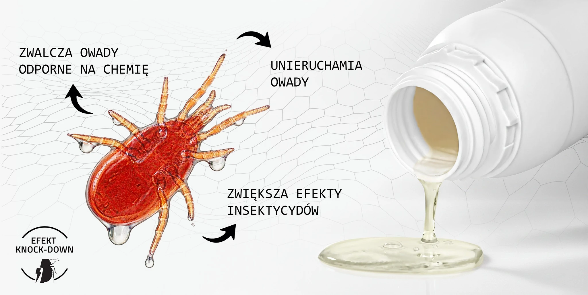 STRONG INSECT BLOCKER POLYMER to profesjonalny preparat o działaniu fizycznym, który po oprysku tworzy trójwymiarową barierę molekularną unieruchamiającą roztocza, ptaszyńce i inne pajęczaki. Zapewnia natychmiastowy efekt knock-down, działa także na populacje odporne na insektycydy, jest bezzapachowy i nie pozostawia plam na typowych powierzchniach. Może być stosowany na powierzchniach roboczych w pomieszczeniach mieszkalnych, gospodarczych oraz w obiektach hodowlanych jako bezpieczna alternatywa dla klasycznych środków chemicznych.