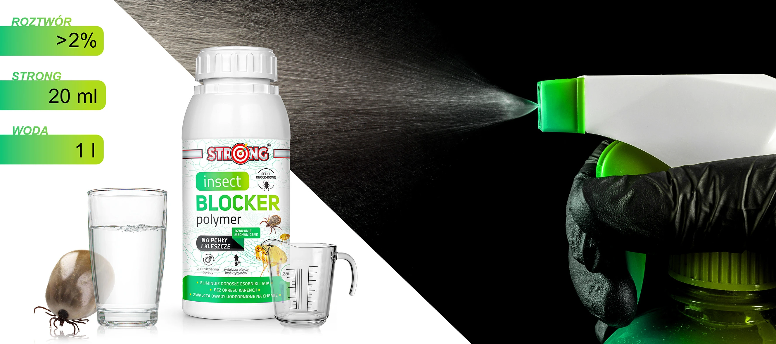 STRONG INSECT BLOCKER POLYMER to innowacyjny koncentrat działający mechanicznie. Tworzy trójwymiarową strukturę molekularną, która unieruchamia kleszcze i pchły poprzez fizyczne otoczenie ich ciała i blokowanie przetchlinek.