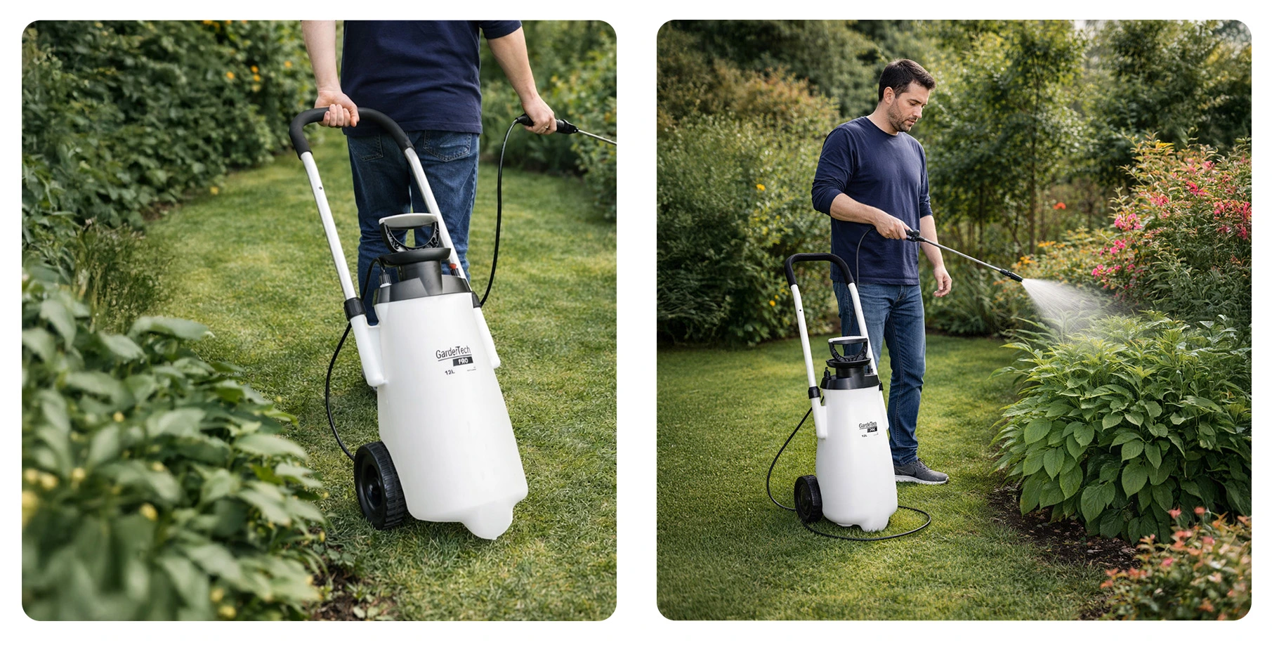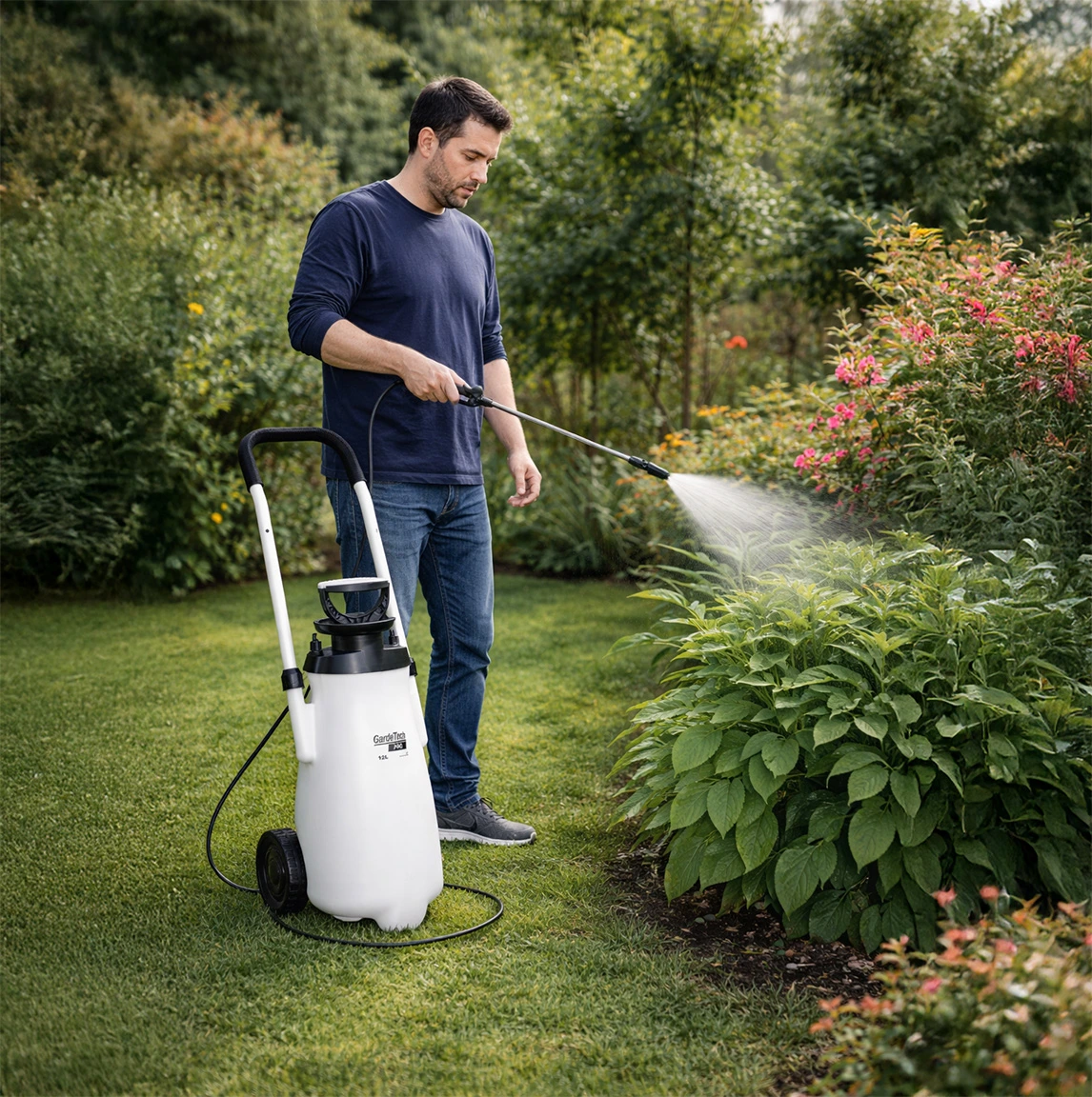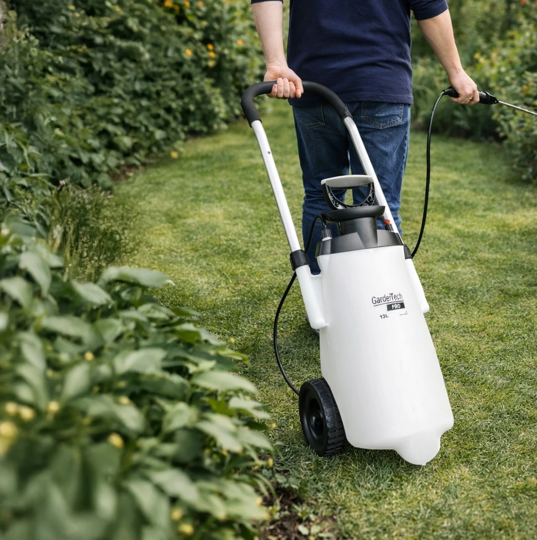 Ciśnieniowy opryskiwacz na kołach GardeTech PRO – idealny do nawozów, herbicydów i pestycydów rozpuszczalnych w wodzie.