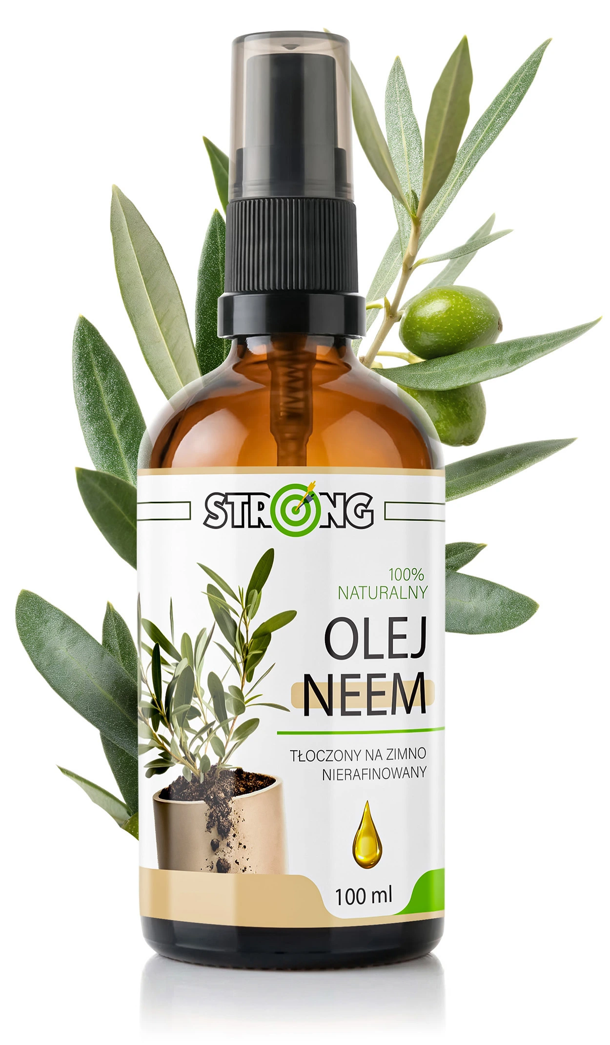 STRONG NATURAL Olej Neem 100 ml to 100% naturalny olej neem nierafinowany pozyskiwany z nasion drzewa neem (miodla indyjska). Produkt wyróżnia się wysoką jakością, intensywnym zapachem oraz szerokim zastosowaniem w domu i ogrodzie. Dzięki praktycznej butelce z pompką umożliwia precyzyjne dozowanie, a skoncentrowana formuła sprawia, że jest wydajny i wystarcza na długi czas.