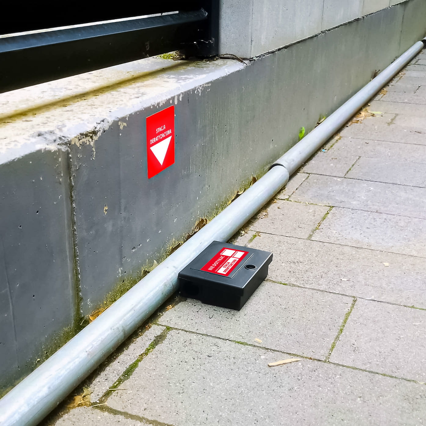 Oznakowanie miejsca: przyklej naklejkę ostrzegawczą bezpośrednio na karmniku i drugą na ścianie w pobliżu stacji, aby poinformować użytkowników obiektu o prowadzonych zabiegach deratyzacyjnych.