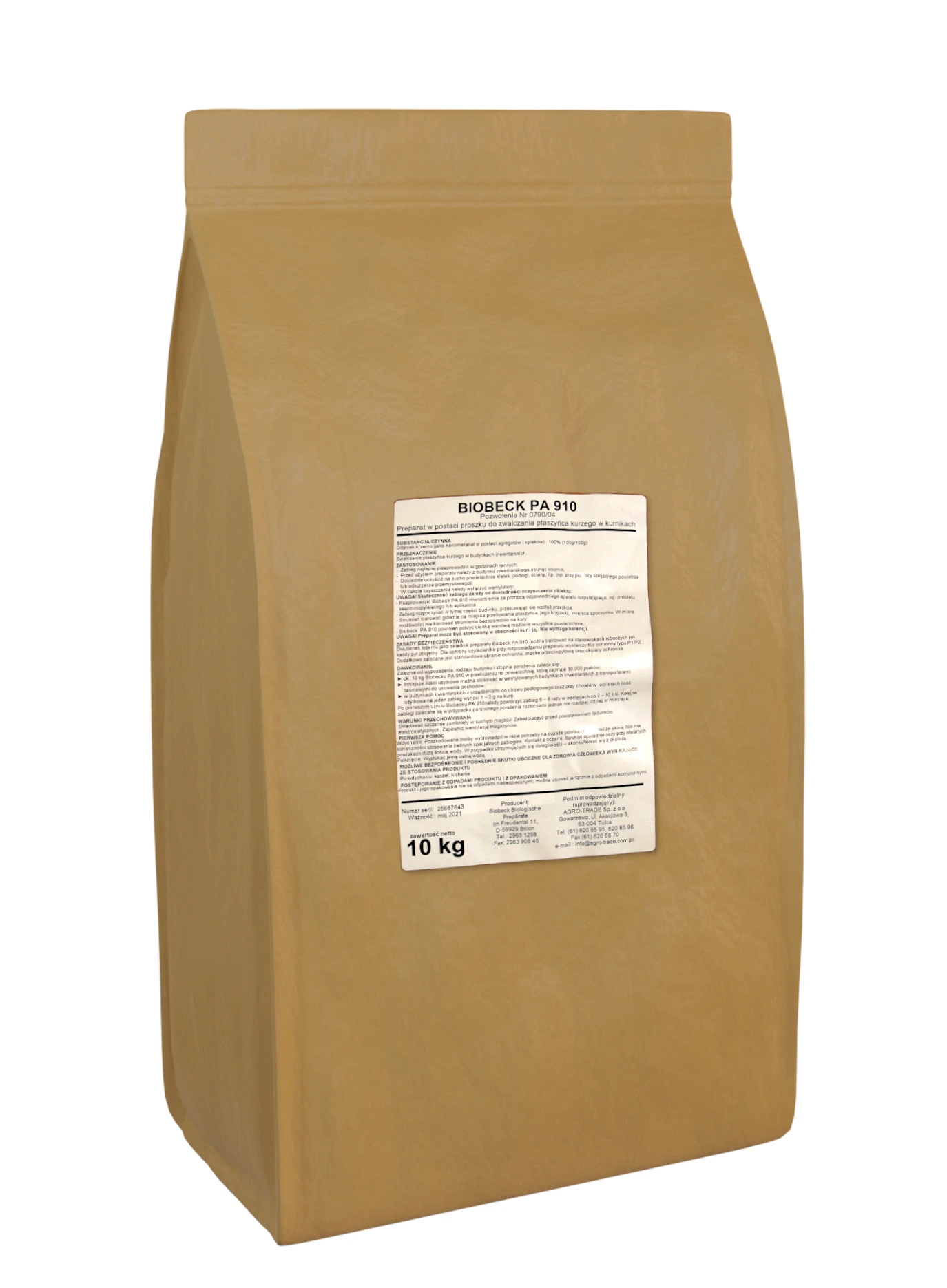 BIOBECK PA 910 to to ekologiczny preparat roztoczobójczy mający zastosowanie przede wszystkim do zwalczania ptaszyńca kurzego (Dermanyssus gallinae). Substancją aktywną preparatu jest dwutlenek krzemu w postaci proszku, który przenika do narządów oddechowych (tchawek), wysusza je od środka oraz blokuje stawy, co prowadzi do unieruchomienia roztoczy i w konsekwencji do ich śmierci.