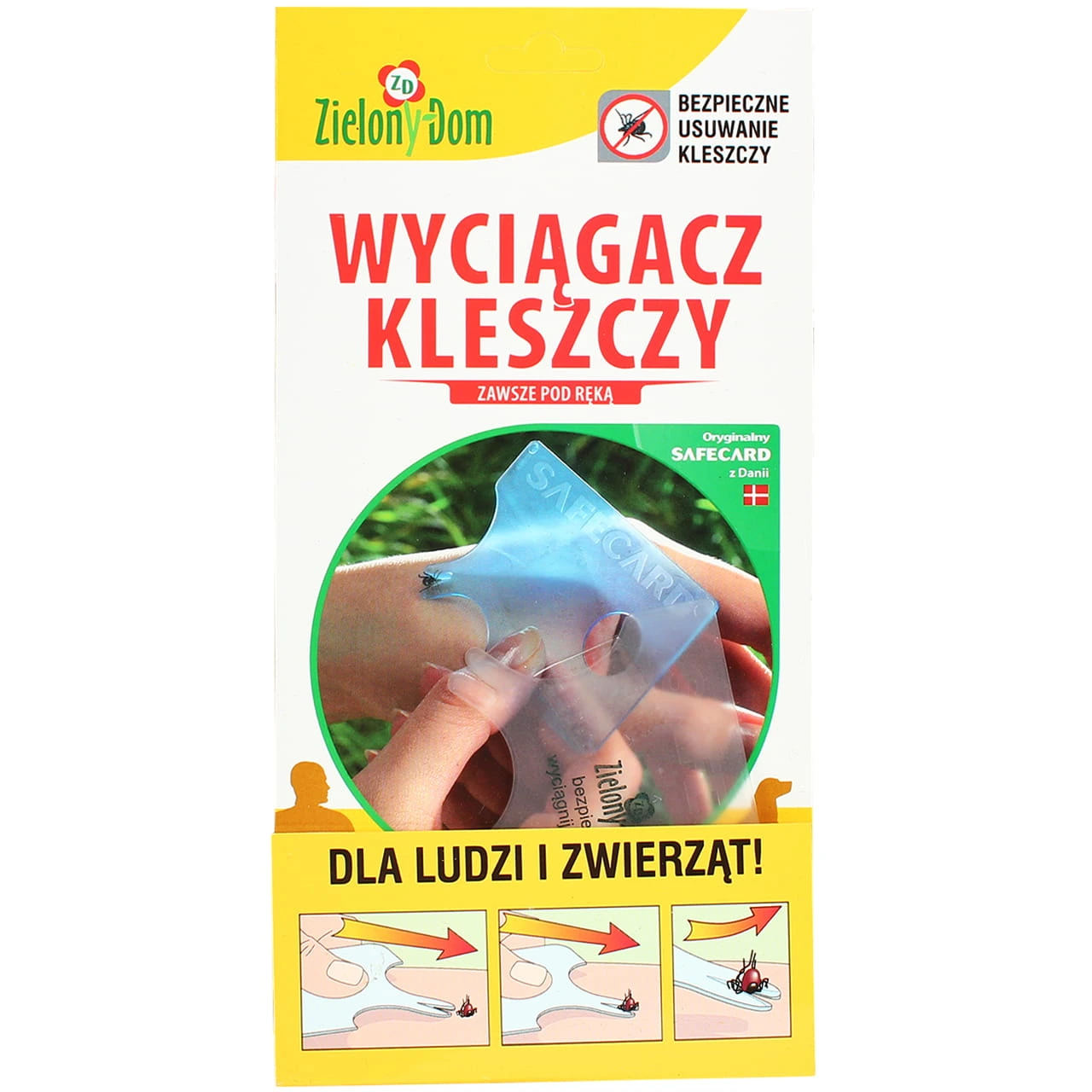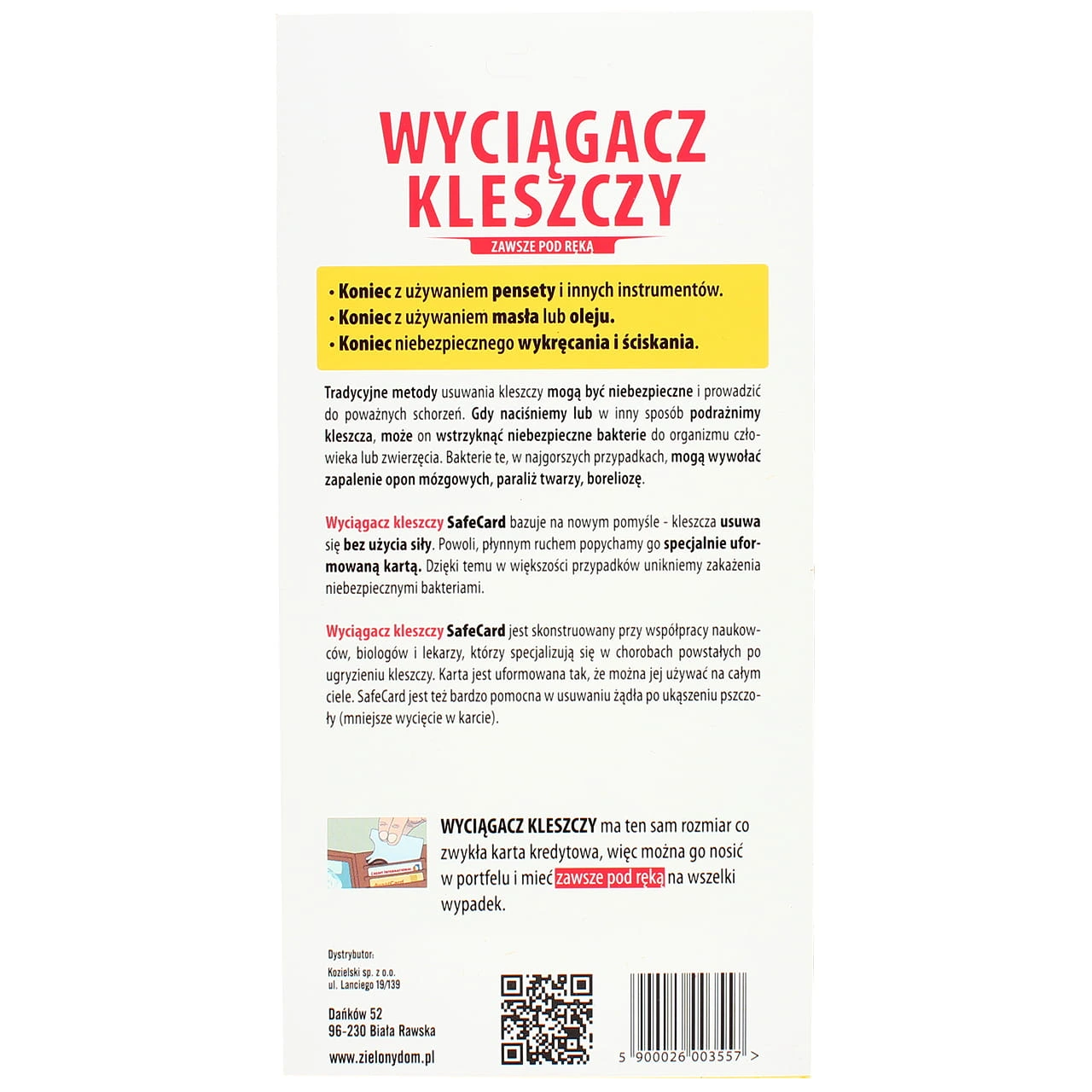 Tradycyjne metody usuwania kleszczy mogą być niebezpieczne i prowadzić do poważnych schorzeń. Gdy naciśniemy lub w inny sposób podrażnimy kleszcza, może on wstrzyknąć niebezpieczne bakterie do organizmu człowieka lub zwierzęcia. Bakterie te, w najgorszych przypadkach, mogą wywołać zapalenie opon mózgowych, paraliż twarzy, boreliozę. Wyciągacz kleszczy SAFECARD bazuje na nowym pomyśle - kleszcza usuwa się bez użycia siły. Powoli, płynnym ruchem popychamy go specjalnie uformowaną kartą. Dzięki temu w większości przypadków unikniemy zakażenia niebezpiecznymi bakteriami.