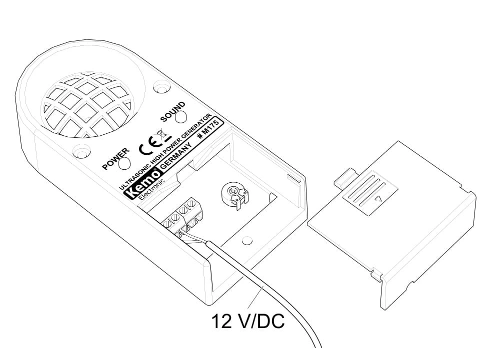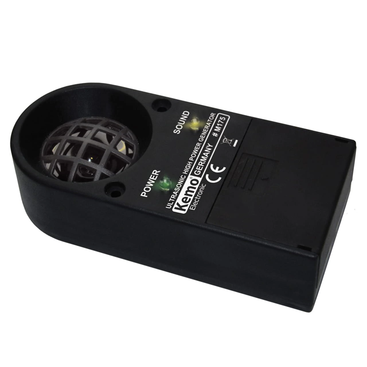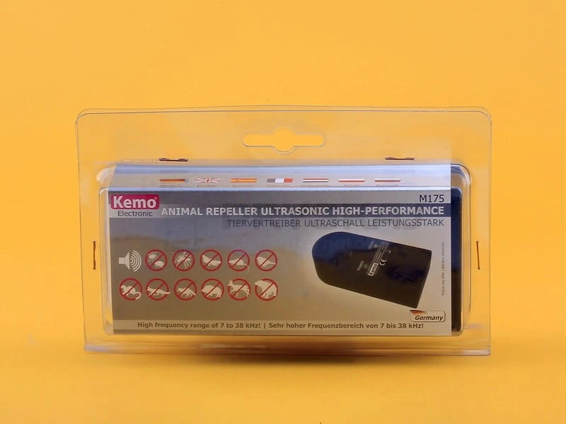 Ultradźwiękowy generator Kemo M175 wytwarzający agresywne sygnały ultradźwiękowe, które odczuwane są przez koty, wydry, psy, kuny, lisy, zające, dziki, jelenie, sarny, gryzonie, insekty pełzające, pasożyty i ptaki jako niezmiernie uciążliwe i których zwierzęta te wolą unikać. Dla maksymalnej skuteczności częstotliwość generatora można dowolnie regulować w zakresie od 7000 do 38000 Hz, a specjalny głośnik z aluminiową membraną kopułkową zapewnia optymalny rozkład dźwięku.