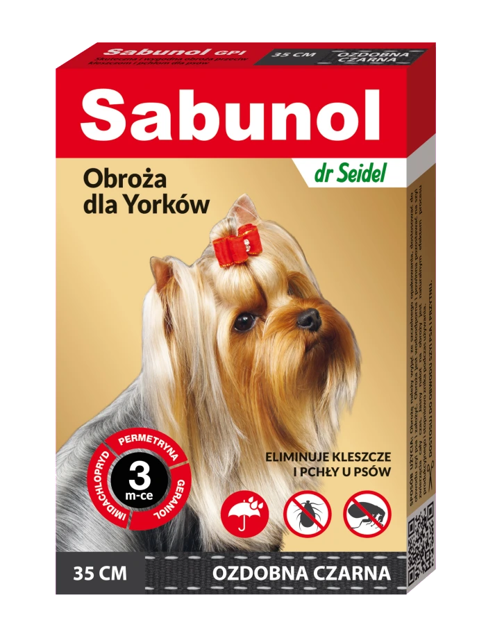 SABUNOL to nowoczesna obroża przeciw kleszczom i pchłom dla Yorków, skuteczna i wygodna w użyciu. Unikatowe połączenie trzech składników: permetryny, imidachloprydu i geraniolu zapewnia skuteczność działania przez 3 miesiące. Badania potwierdzają wysoką tolerancję miejscową i ogólną, co sprawia, że obroża jest bezpieczna podczas stosowania. Dodatkowo hamuje namnażanie pcheł, niszcząc ich jaja i larwy. Obroża jest odporna na działanie warunków atmosferycznych, woda nie osłabia jej działania.