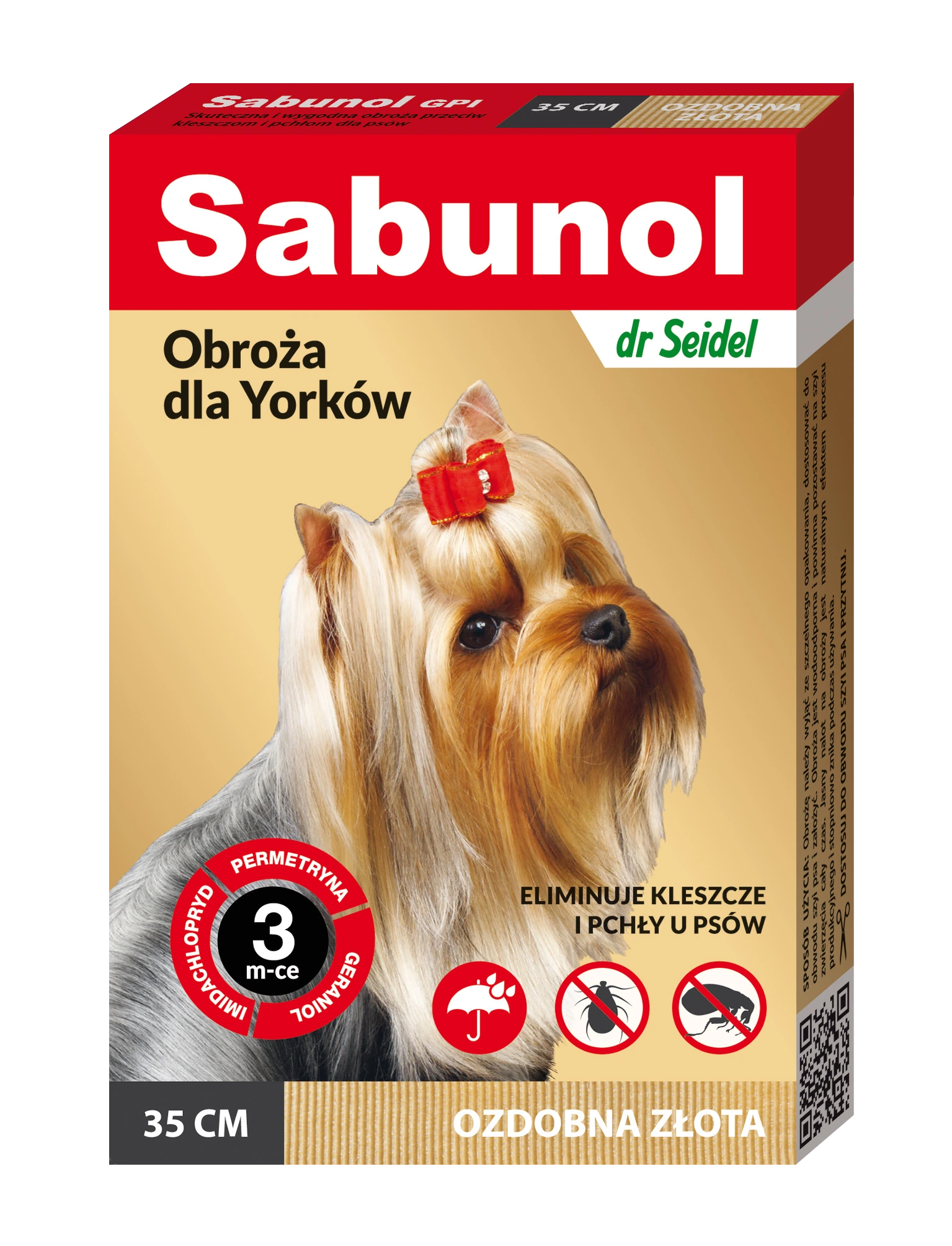 SABUNOL OBROŻA OWADOBÓJCZA DLA YORKÓW 35 CM ELIMINUJE KLESZCZE I PCHŁY U PSÓW DO 3 MIESIĘCY TOTALNEJ OCHRONY   ✅ skuteczna na pchły i kleszcze ✅ chroni nawet do 90 dni ✅ niszczy jaja i larwy ✅ odporna na działanie wilgoci ✅ zawiera 3 substancje czynne ✅ obroża ozdobna złota OPIS PRODUKTU SABUNOL to nowoczesna obroża przeciw kleszczom i pchłom...