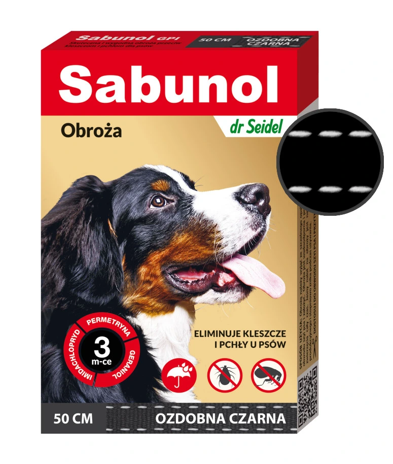 SABUNOL OBROŻA OWADOBÓJCZA DLA PSÓW 50 CM ELIMINUJE KLESZCZE I PCHŁY U PSÓW DO 3 MIESIĘCY TOTALNEJ OCHRONY   ✅  skuteczna na  pchły  i  kleszcze ✅  chroni nawet  do 90 dni ✅  niszczy  jaja i larwy ✅   odporna na działanie wilgoci ✅  zawiera  3 substancje czynne ✅  obroża  ozdobna czarna OPIS PRODUKTU SABUNOL  to nowoczesna  obroża przeciw kleszczom...