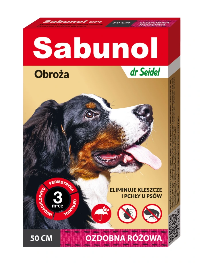 SABUNOL to nowoczesna obroża przeciw kleszczom i pchłom dla psów, skuteczna i wygodna w użyciu. Unikatowe połączenie trzech składników: permetryny, imidachloprydu i geraniolu zapewnia skuteczność działania przez 3 miesiące. Badania potwierdzają wysoką tolerancję miejscową i ogólną, co sprawia, że obroża jest bezpieczna podczas stosowania. Dodatkowo hamuje namnażanie pcheł, niszcząc ich jaja i larwy. Obroża jest odporna na działanie warunków atmosferycznych, woda nie osłabia jej działania.