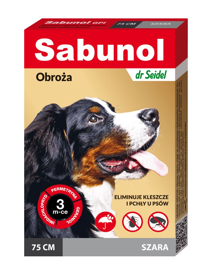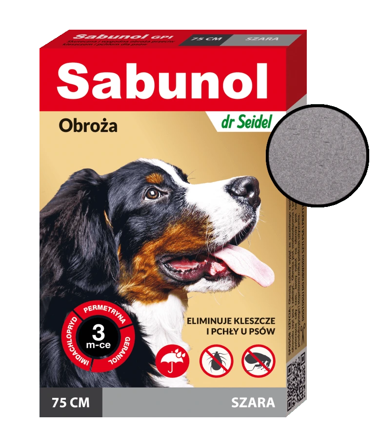 SABUNOL to nowoczesna obroża przeciw kleszczom i pchłom dla psów, skuteczna i wygodna w użyciu. Unikatowe połączenie trzech składników: permetryny, imidachloprydu i geraniolu zapewnia skuteczność działania przez 3 miesiące. Badania potwierdzają wysoką tolerancję miejscową i ogólną, co sprawia, że obroża jest bezpieczna podczas stosowania. Dodatkowo hamuje namnażanie pcheł, niszcząc ich jaja i larwy. Obroża jest odporna na działanie warunków atmosferycznych, woda nie osłabia jej działania.
