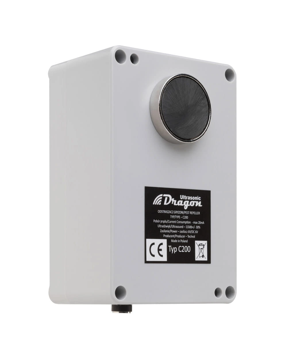 ULTRASONIC DRAGON C200 emituje zmienne ultradźwięki, które niekorzystnie wpływają na układ nerwowy gryzoni, uniemożliwiając im dłuższe przebywanie w okolicy urządzenia i w efekcie opuszczenie miejsc chronionych przez odstraszacz. Urządzenie wyposażone jest w tradycyjny układ tranzystorowy, co gwarantuje świetne parametry oraz wysoką niezawodność. Dostępne na Polskim rynku w dużej mierze chińskie zamienniki i odstraszacze są wyposażone w mikroprocesorowe układy sterowania, co powoduje, że są bardziej narażone na uszkodzenia zewnętrzne oraz maja mniejszy zasięg działania.