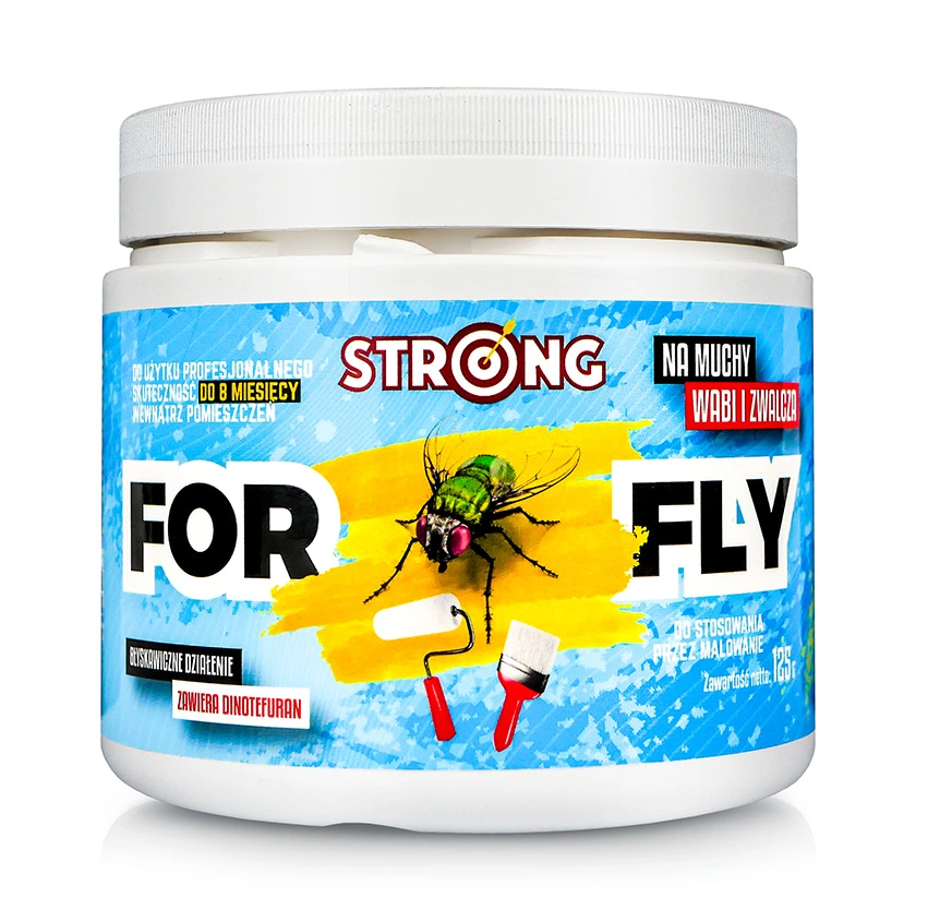 STRONG FOR FLY to specjalistyczny preparat na muchy w formie proszku do rozpuszczania w wodzie i malowania powierzchni. Środek na muchy jest przeznaczony do zwalczania owadów latających wewnątrz budynków. Preparat owadobójczy działa kontaktowo i wnika do organizmu muchy podczas dotykania powierzchni pomalowanej preparatem, co skutecznie eliminuje różne gatunki muchówek.