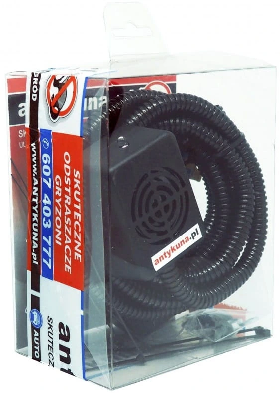 Odstraszacz ANTYKUNA nadaje impulsowo ultradźwięki o różnych częstotliwościach, które wyjątkowo drażnią układ słuchowy między innymi kun, ale również gryzoni, lisów, psów, i wielu innych. Zastosowanie: do zabudowanych silników z osłonami z tworzyw sztucznych, który wymaga zabezpieczenia z dwóch stron silnika. Przy braku płyty zabezpieczającej pod silnikiem - jeden z głośników powinien być skierowany w miejsce pozbawione osłony, drugi w stronę skrzyni biegów, zawieszenia. Dwa odstraszacze połączone kablem, zapewniają działanie po obu stronach silnika. Wbudowany mikroprocesor jest zaprogramowany na emitowanie zmiennych ultradźwięków. Ciągle nowe sygnały sprawiają, że kuna się nie przyzwyczaja.
