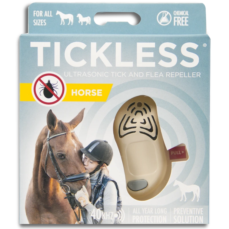 TICKLESS HORSE BEIGE to urządzenie chroniące przed pchłami i kleszczami, przeznaczone dla dużych zwierząt. Emituje impulsy ultradźwiękowe o częstotliwości 40 kHz, które są nieszkodliwe dla ludzi oraz zwierząt domowych, czy gospodarskich, blokują jednak główny narząd zmysłowy kleszczy - narząd Hallera. Kleszcze wykorzystują narząd Hallera do namierzania żywiciela. Gdy kleszcz znajdzie się w zasięgu ultradźwięków emitowanych przez TICKLESS będzie zdezorientowany i nie wyczuje swojej ofiary - urządzenie oddziałuje na zmysły kleszczy, zaburzając ich zdolności postrzegania - zwierze staje się niewidoczne dla kleszcza. Urządzenie wykazuje również skuteczność w ochronie przed pchłami. Skuteczny obszar ochrony to promień o długości około 2 m. TICKLESS nie wykorzystuje substancji toksycznych/chemicznych i jest całkowicie bezpieczny dla zwierząt domowych, gospodarskich oraz ludzi.