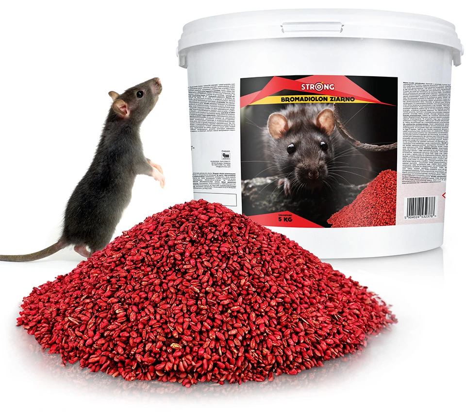 Bardzo skuteczny środek gryzoniobójczy STRONG BROMADIOLON ZIARNO w formie atrakcyjnej mieszkanki zatrutego ziarna do zwalczania myszy i szczurów. Gryzonie po przyjęciu dawki preparatu giną bezstresowo z powodu wewnętrznego krwotoku długo po spożyciu (produkt nie prowadzi do zgonu przed upływem 48 godzin, nawet po spożyciu dużej dawki) i daleko od miejsca wyłożenia.
