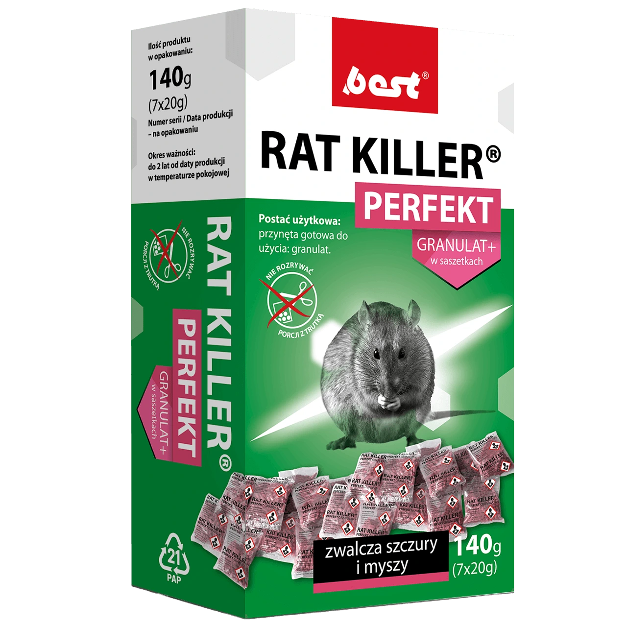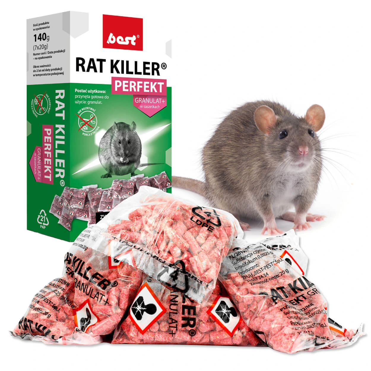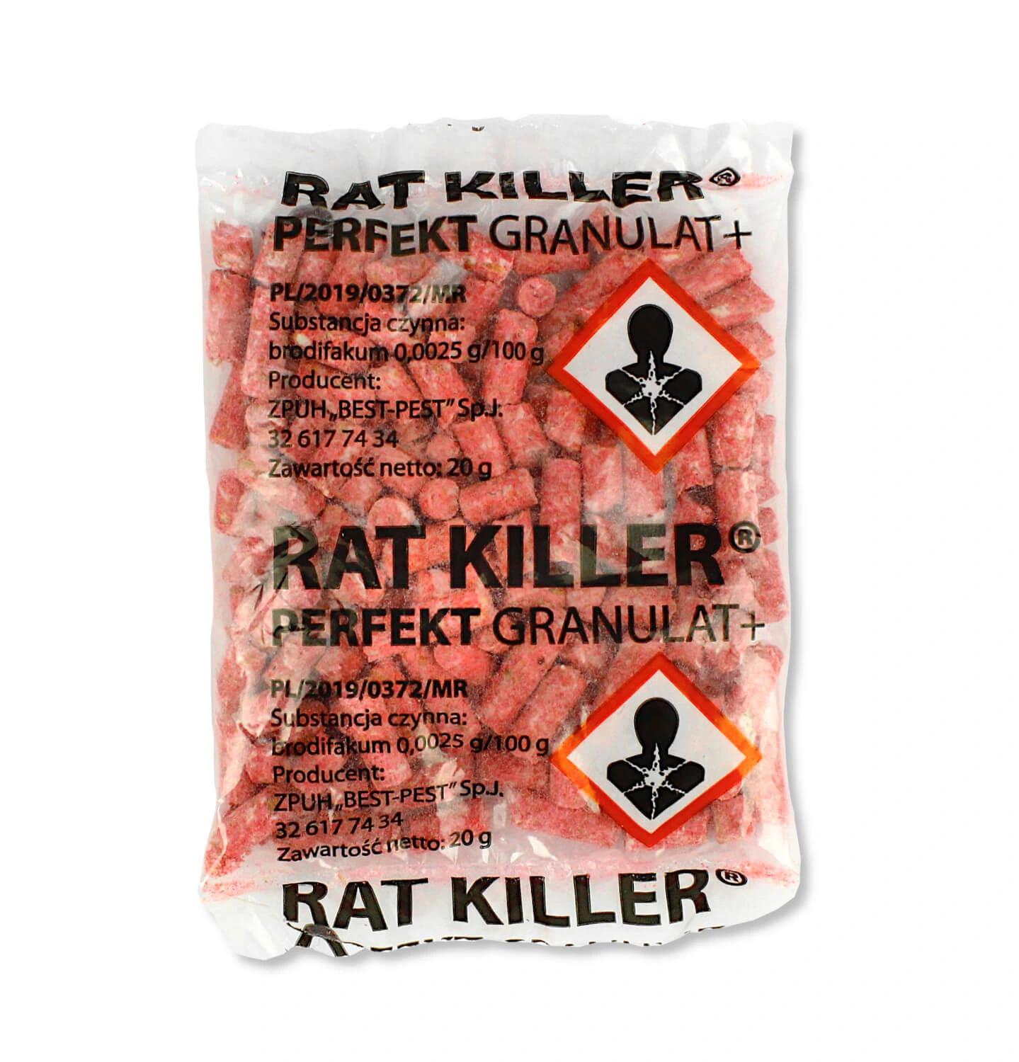 RAT KILLER PERFEKT granulat jest gotową do użycia granulowaną przynętą do zwalczania szczurów i myszy. Dzięki zastosowaniu atrakcyjnych dla gryzoni atraktantów RAT KILLER PERFEKT jest wyczuwalny z dużej odległości i chętnie pobierany przez szkodniki. Preparat zawiera benzoesan denatonium, substancję o gorzkim smaku, zabezpieczającą przed przypadkowym spożyciem przez człowieka. Przynęta przeznaczona jest do użytku wewnątrz oraz wokół budynków (mieszkalnych, użyteczności publicznej, inwentarskich, przemysłowych, magazynowych itp.) przez użytkowników profesjonalnych.