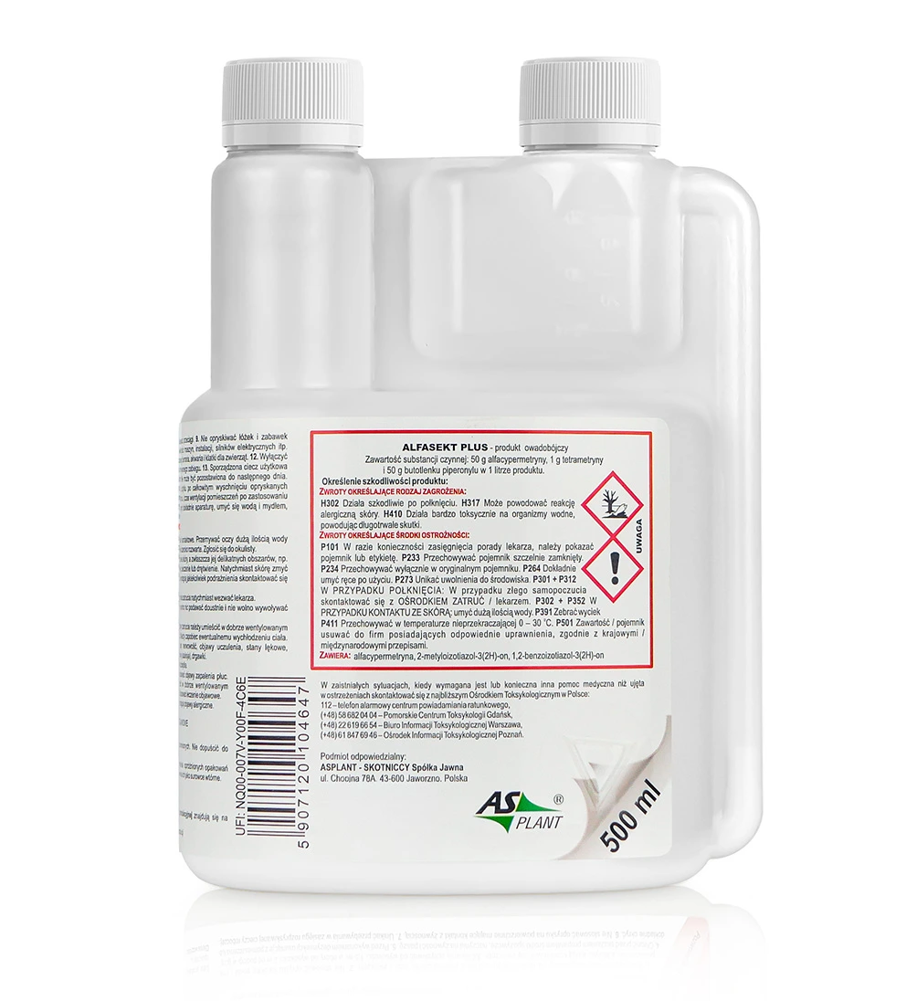 skład: Alfa-cypermetryna – 50 g/l, Butotlenek piperonylu – 50 g/l, Tetrametryna – 1 g/l