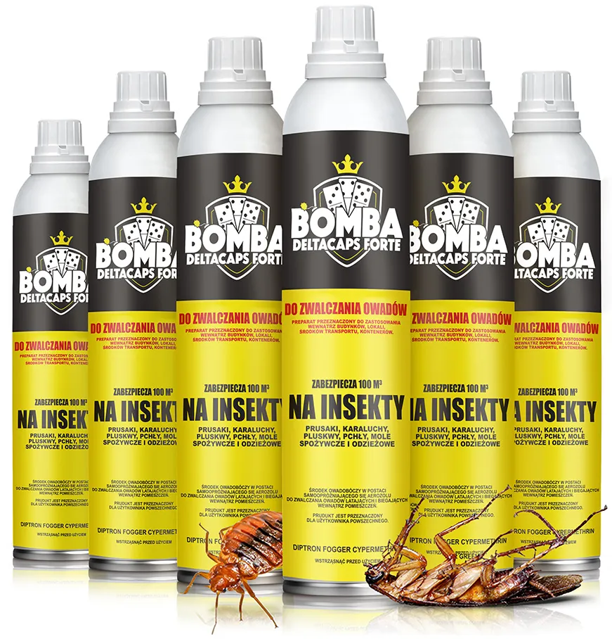 Profesjonalny zestaw 6 sztuk preparatów owadobójczych zwalczających pluskwy i karaluchy. Produkt w formie zamgławiacza (tzw. bomba dymna) działa skutecznie już po jednym użyciu, docierając w szczeliny, zakamarki i miejsca trudno dostępne dla zwykłych środków.