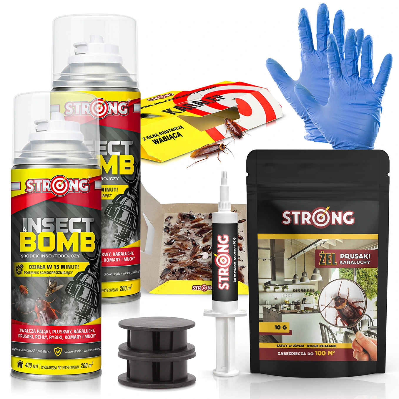 Zestaw środków do zwalczania prusaków i karaluchów ( 2x bomba, 2x karmnik, 1x trutka żelowa, 1x lep, 1 para rękawic) - Zestaw na karaczany ROACH PROTECTOR